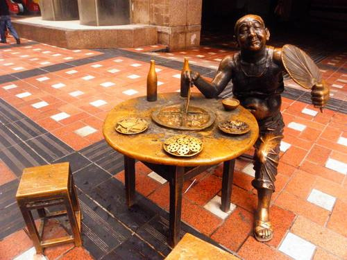 的铜雕最为人熟悉,将重庆人烫火锅时的悠闲自在和市井气息展现的淋漓尽致。